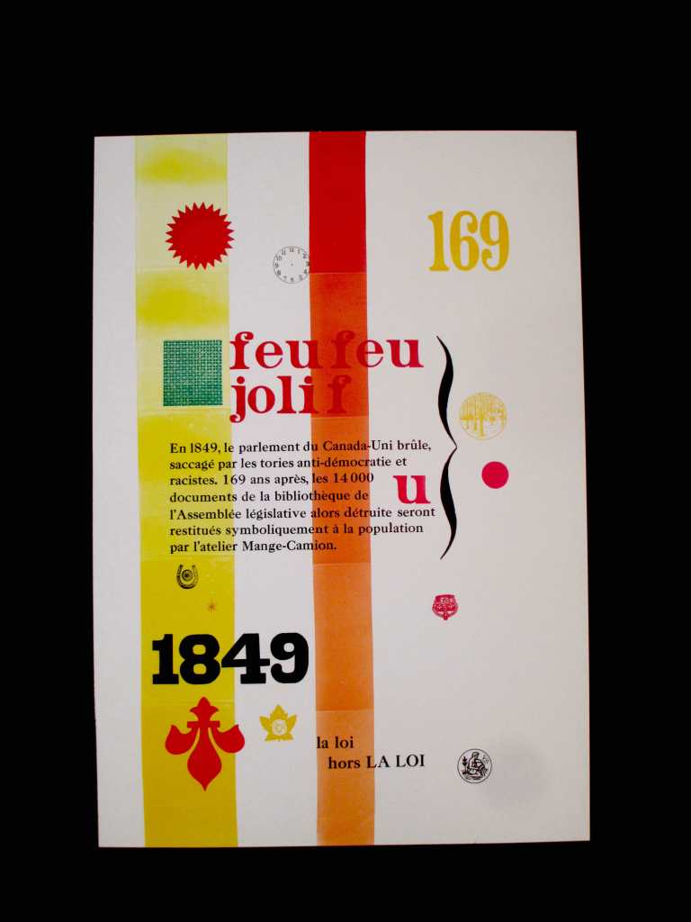 Feu Feu Joli F est une installation et happening littéraire exigeant une prise de responsabilité sociale dans l’évolution de la culture et du politique. Celle-ci éclaire, réchauffe et brûle avec ses braises l’image de notre modernité politique dont elle dégage des ancrages historiques importants. Interactive, elle conduit le chantier ardant de la restitution symbolique du trésor d’une bibliothèque publique dont la destruction révèle une part sombre de l’histoire canadienne. Les visiteur-teuse-s repartent chacun-e avec une carte mémoire logeant une allumette et une référence de livre brûlé qu’ielle peuvent redécouvrir en format numérisé. Concrètement, cette percée de lumières encourage l’appropriation d’enjeux essentiels pour le progrès démocratique