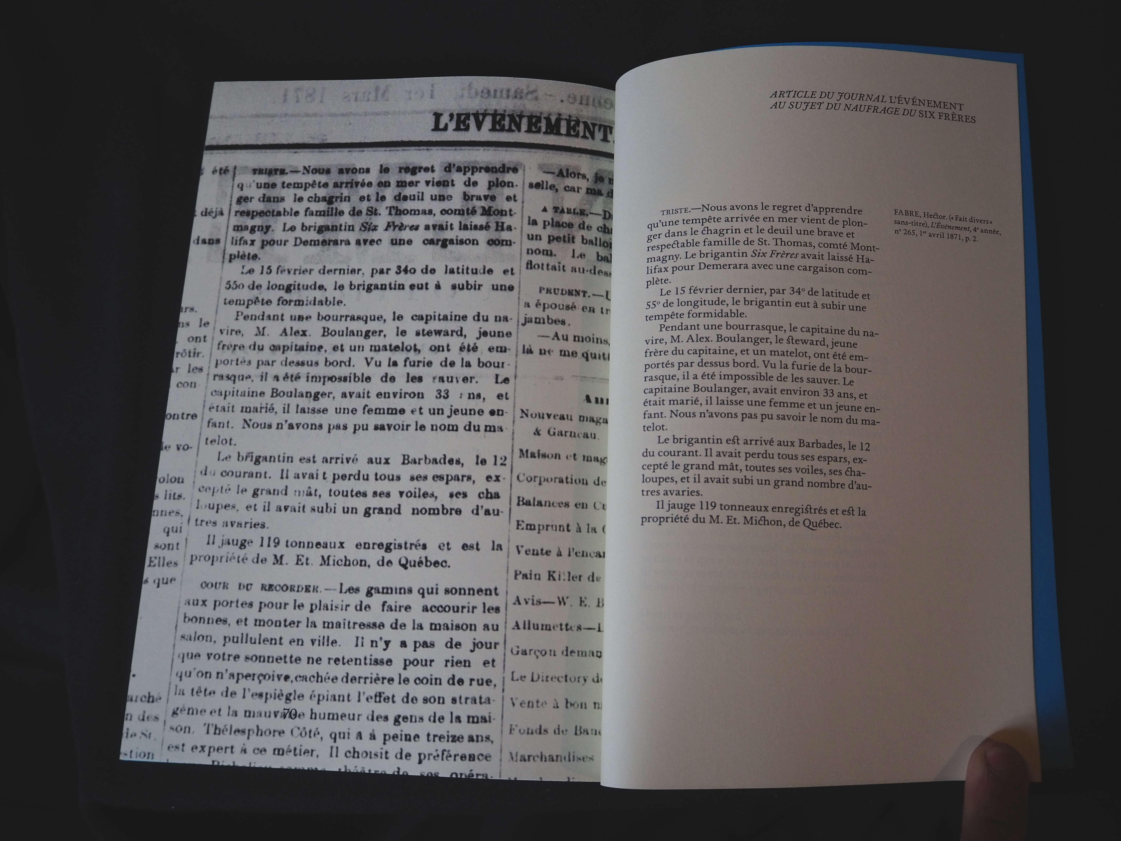 Auteur-trices : Marie Rousseau – transcription originale du témoignage d’Elzéar ; Dalie Giroux – rédaction de la préface ; Mathieu Parent – auteur de l’essai ; Dominique Rivard – design du livre